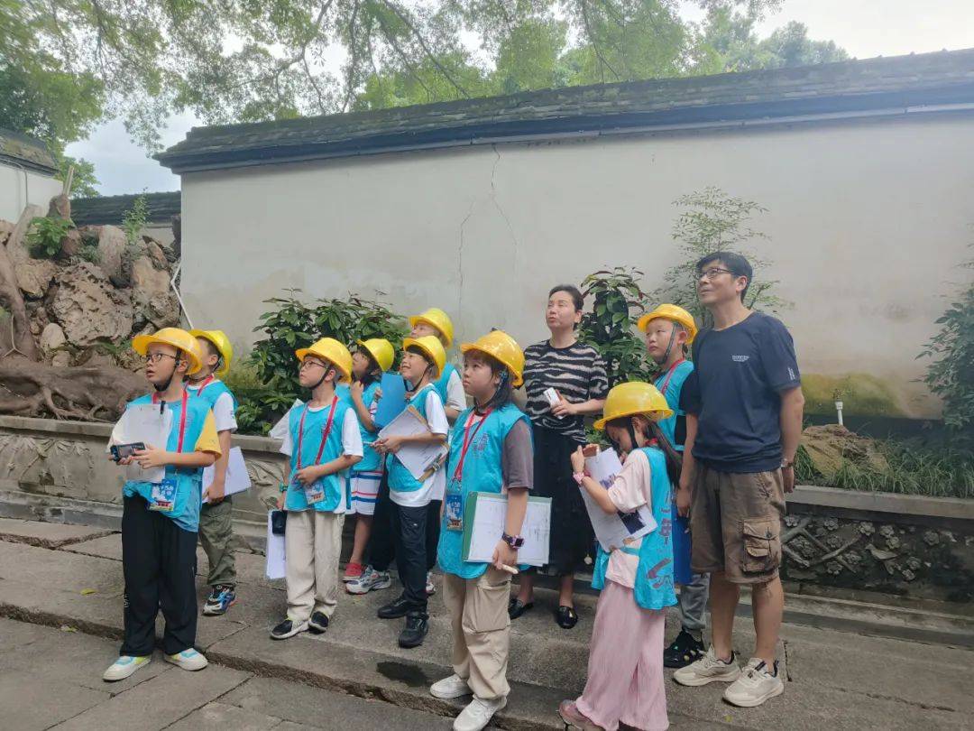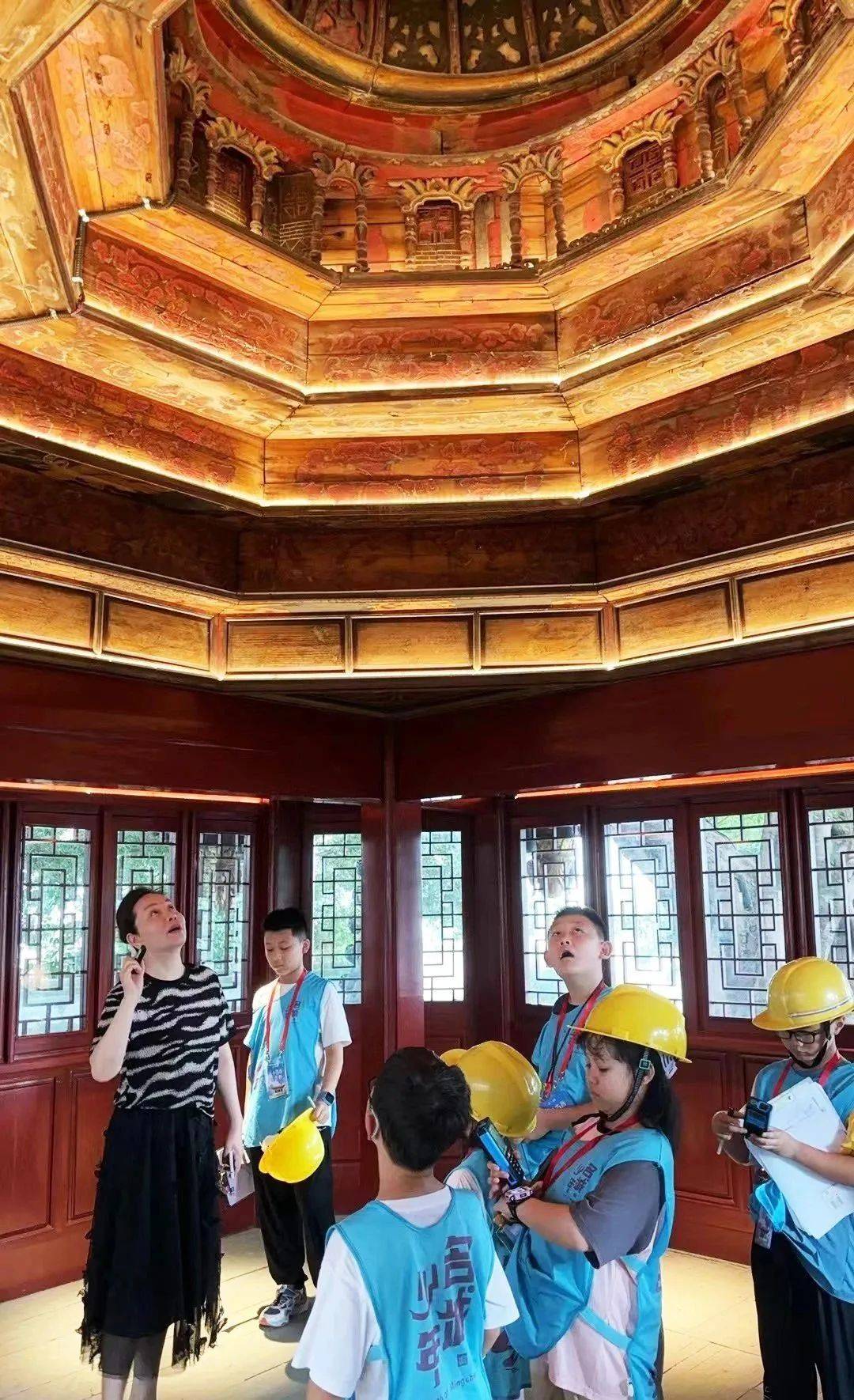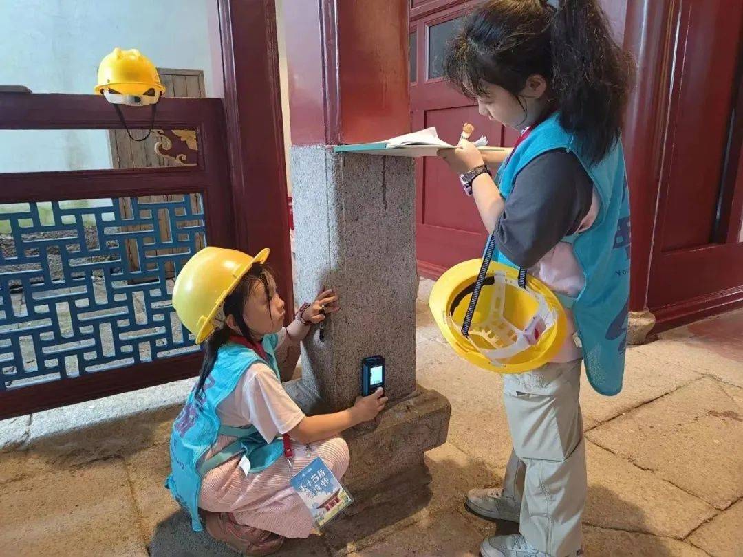 在授课老师的引领与指导下,“小小古厝营造师”们化身为“小小古厝建筑学家”。他们佩戴安全帽、携带卷尺、手套、测距仪等专业工具,对古建筑结构的关键数据进行了细致地观察与测量。通过亲身实践体验,获得了关于古建筑的第一手资料。