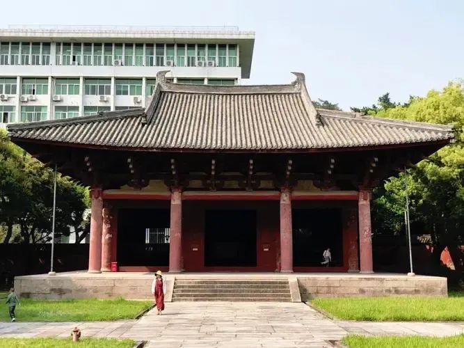 福州华林寺大殿就是抬梁式构架,包裹着宋代初建时的构架,为单檐歇山顶,坐北朝南,平面近方形,面阔三间,进深四间,高15.5米,面积574平方米,共用檐柱14根,内柱4根。
