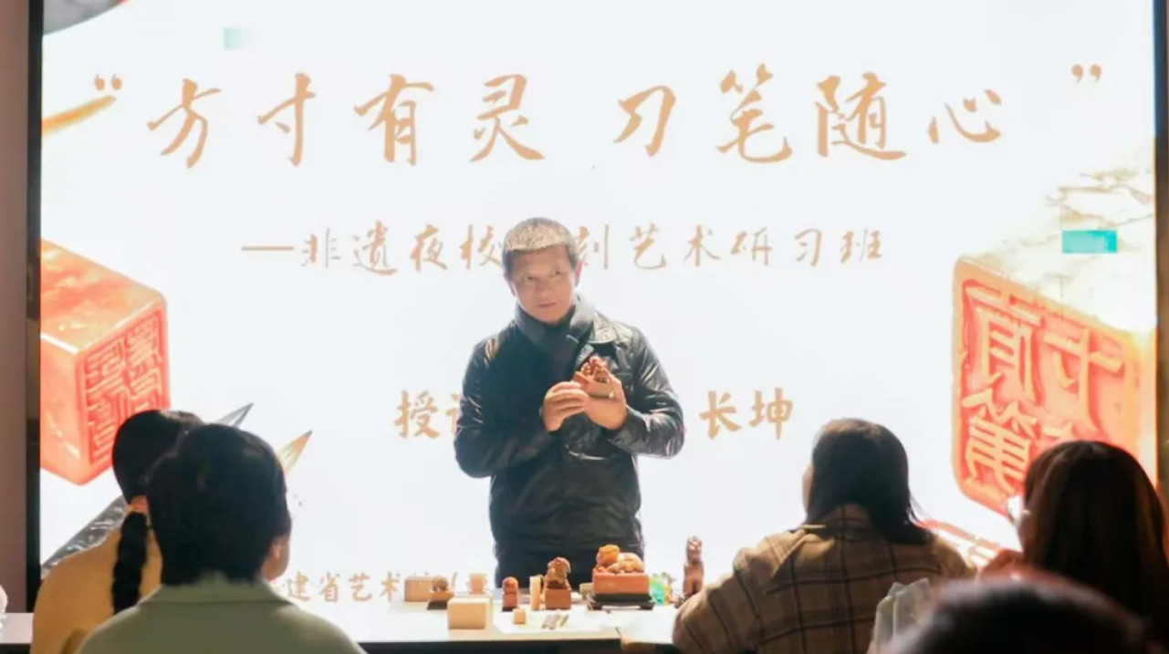 2月6日晚,为期四讲的篆刻艺术研习班在福建省非物质文化遗产博览苑圆满结课。15位学员们以刀为笔,以石为纸,在方寸之间开启了一场与传统篆刻艺术的深度对话。从首次执刀的忐忑到独立完成作品的自信,学员们用一刀一刻,刻下了对千年金石美学的理解与热爱。