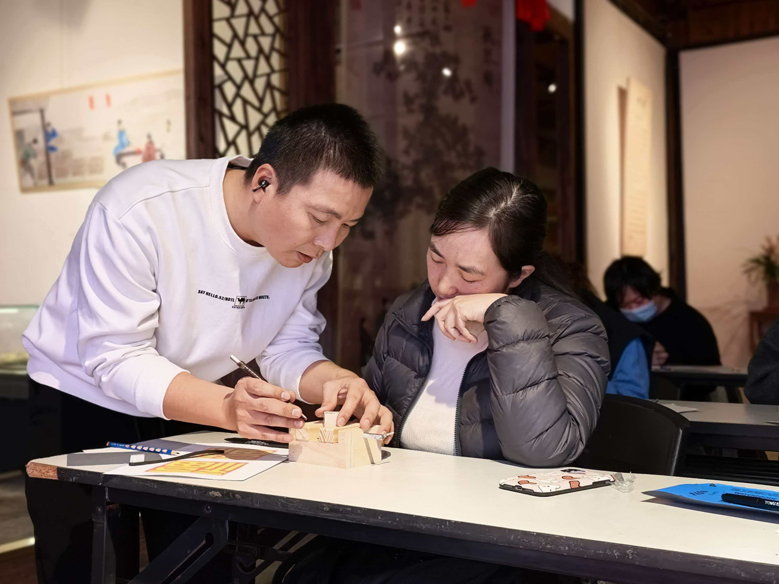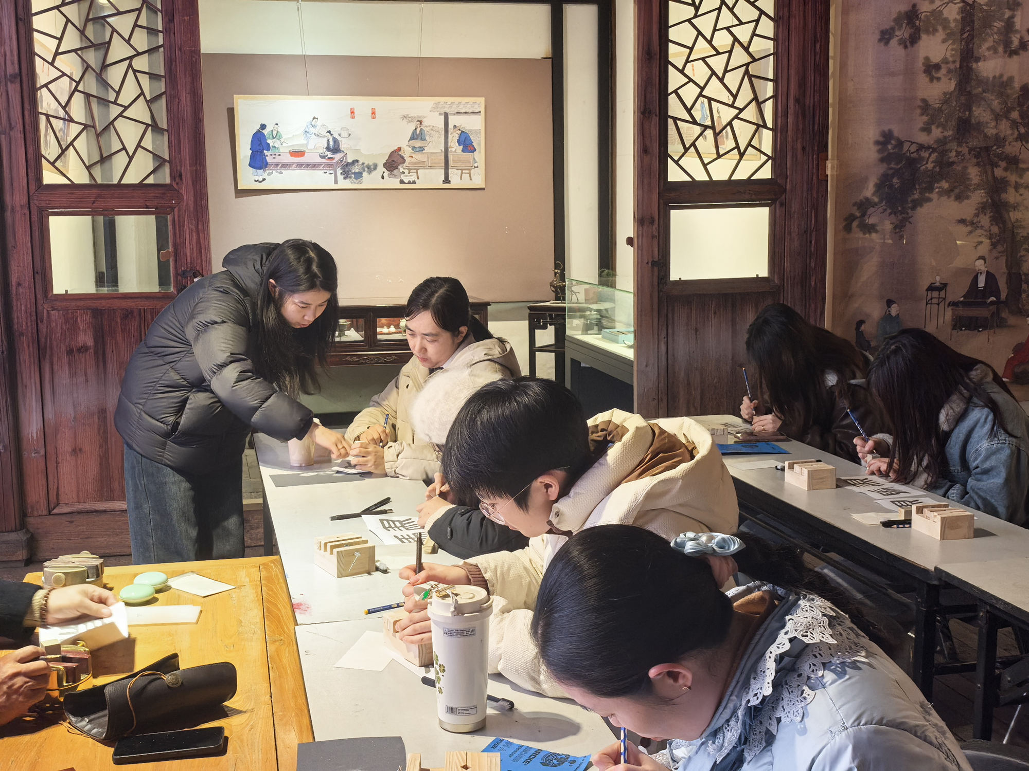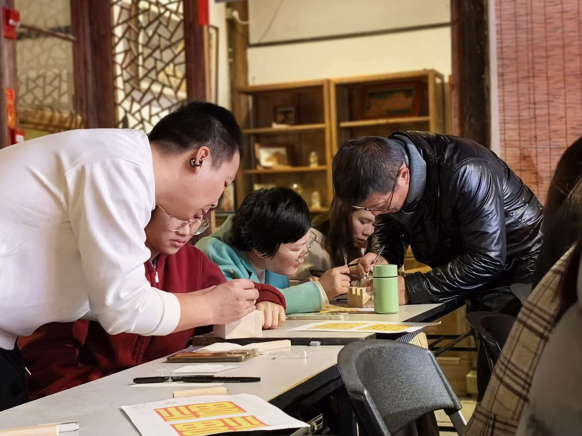 “冲刀要流畅,切刀要稳健”。在老师手把手的指导下,学员们从直线练到曲线,终于掌握了基本刀法。这节课最开心的时刻,就是每个人都成功刻出了自己的姓名章——当名字第一次以印章的形式呈现,那种成就感难以言表!